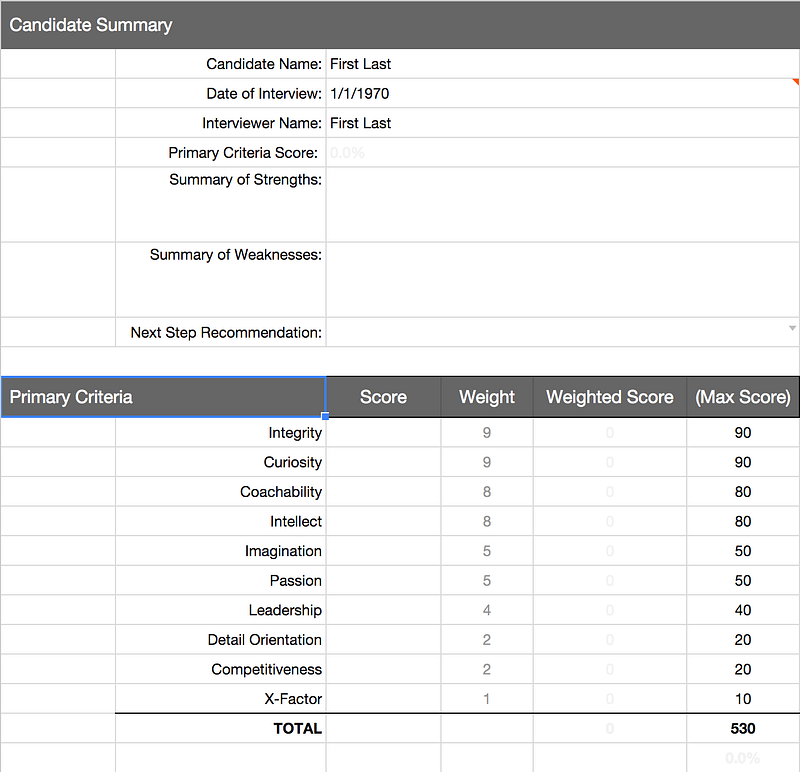 Not every hire has to score perfect along all of these axes; instead, each candidate is given a 1–10 score on each one. These scores are multiplied by a numeric weight value to generate a total score for each candidate. Candidates’ total scores are compared to each other, rather than each individual characteristic.